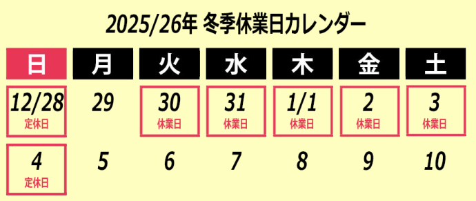 休業日:2025年12月30日(火)~2026年1月4日(日)