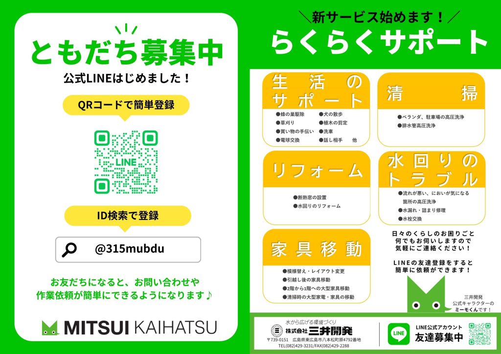 三井開発で公式LINEを始めました。QRコードもしくはID検索で簡単に友達登録できます!LINEでお友達になると、お問い合わせや作業依頼がLINEで簡単にできるようになります。